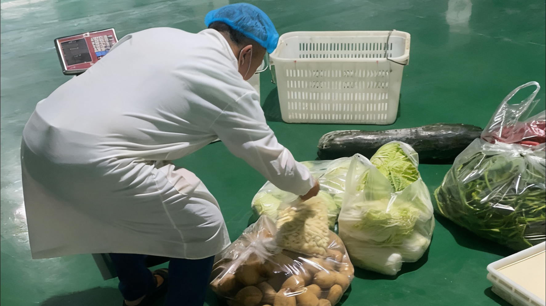 清晨即起,嚴把安全關(guān)卡。10月3日早上6點,天光未亮,中心倉已是燈火通明。倉庫門口,工作人員正對首批送達的蔬菜執(zhí)行嚴格的“到貨四步法”:稱重核斤兩、觀色辨新鮮、溯源查憑證、記錄保精準,確保每一份食材從源頭就符合標準。